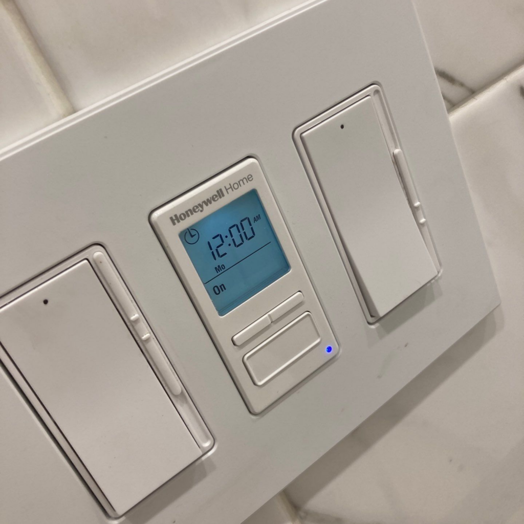Bathroom exhaust fan runs on a scheduled timer for steady ventilation.